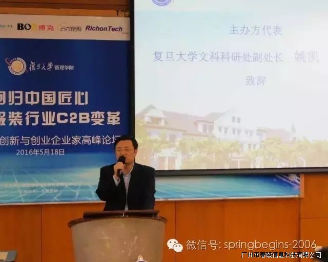 5月18日下午13:00,万众期待的“引领服装行业C2B变革,创新与创业企业家高峰论坛”在复旦大学管理学院如期召开并于下午17:30完美落幕,本次论坛由复旦大学管理学院主办、广州星空电竞信息科技有限公司协助举办,会场内座无虚席,200余人到场参会。论坛邀请了多位资深学者、成功企业家等重磅嘉宾纯干货主题演讲,受到广泛好评,会议进行中掌声持续响起。